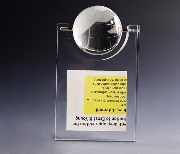 這款亞克力獎杯,可橫放也可豎放,中間的紙是采用無縫熱壓的制作工藝,紙上的內(nèi)容可以根據(jù)要求印制,頂端的是地球形狀的透明亞克力球,用兩根五金連接固定,可自由轉(zhuǎn)動,球上面的大陸板塊采用磨砂效果標(biāo)識,海洋區(qū)透明,并且還設(shè)計有極細(xì)的經(jīng)緯度線,標(biāo)識分別明顯極具逼真效果。