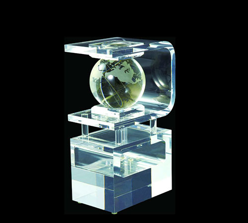 頂端的地球形狀的透明亞克力球,上面的大陸板塊采用磨砂效果標(biāo)識,海洋區(qū)透明,并且還設(shè)計有極細(xì)的經(jīng)緯度線,標(biāo)識分別明顯極具逼真效果;