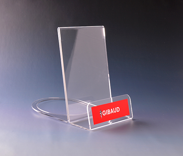 亞克力展示架(資料架),整體由一塊透明亞克力折彎成型,中間可夾一張A4的廣告宣傳單,前面可擺放產(chǎn)品,正面底部加印logo.