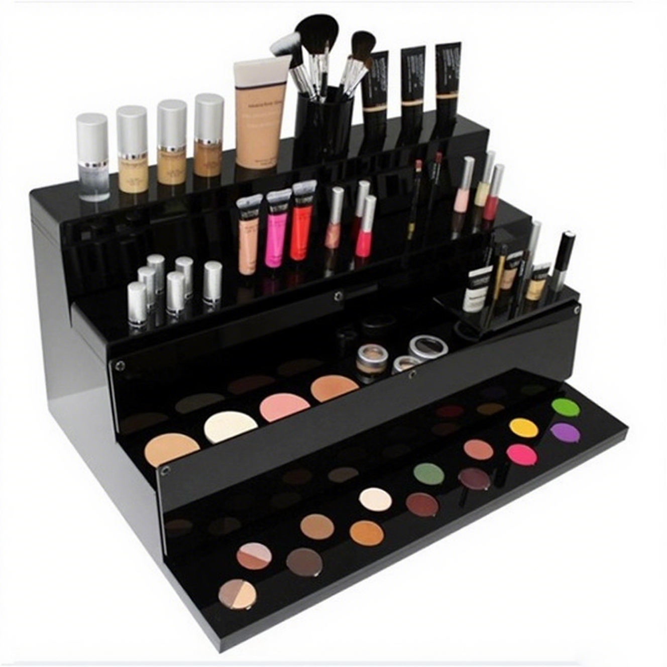 這款多層亞克力化妝品收納架采用黑色為主,外表光滑平整邊緣無刮手,通過切割和粘接等加工方式制作成各種形狀和尺寸,能夠滿足不同展示需求。整體呈階梯式結(jié)構(gòu)。分為上層設(shè)有多個(gè)垂直分隔槽;中層為開放式平臺,;下層是帶抽屜的設(shè)計(jì),方便存放小物件。透明度高的亞克力材質(zhì)與黑色框架形成簡約現(xiàn)代風(fēng)格,能清晰展示內(nèi)部物品,適合梳妝臺整理使用。